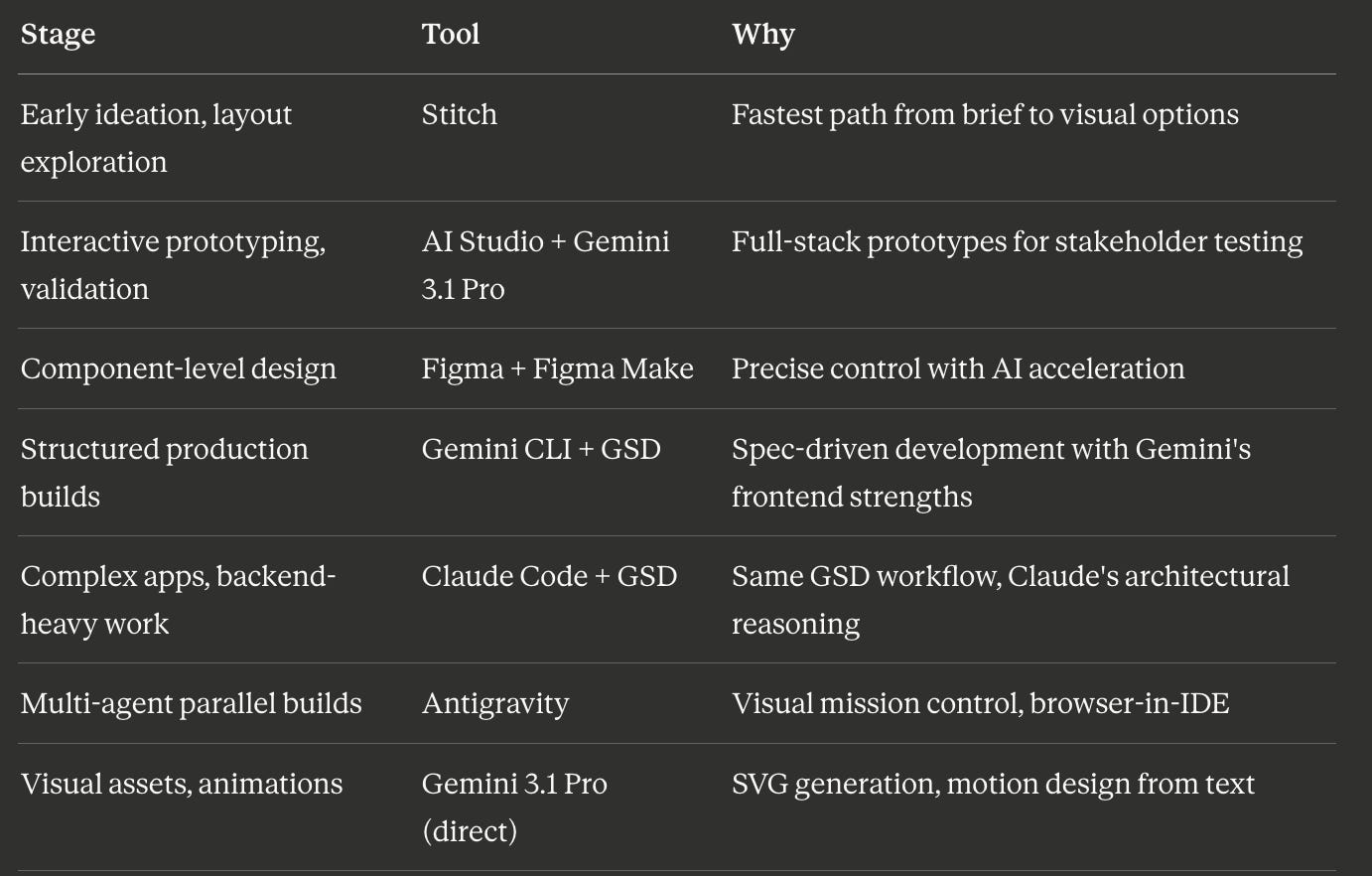 Some users on X recommend an even more granular split: Gemini for UI, Claude Opus for planning and logic, GPT-Codex for specific backend tasks. I think that’s overkill for most designers. Two models: Gemini for frontend/visual, Claude for backend/structure, covers 90% of use cases.